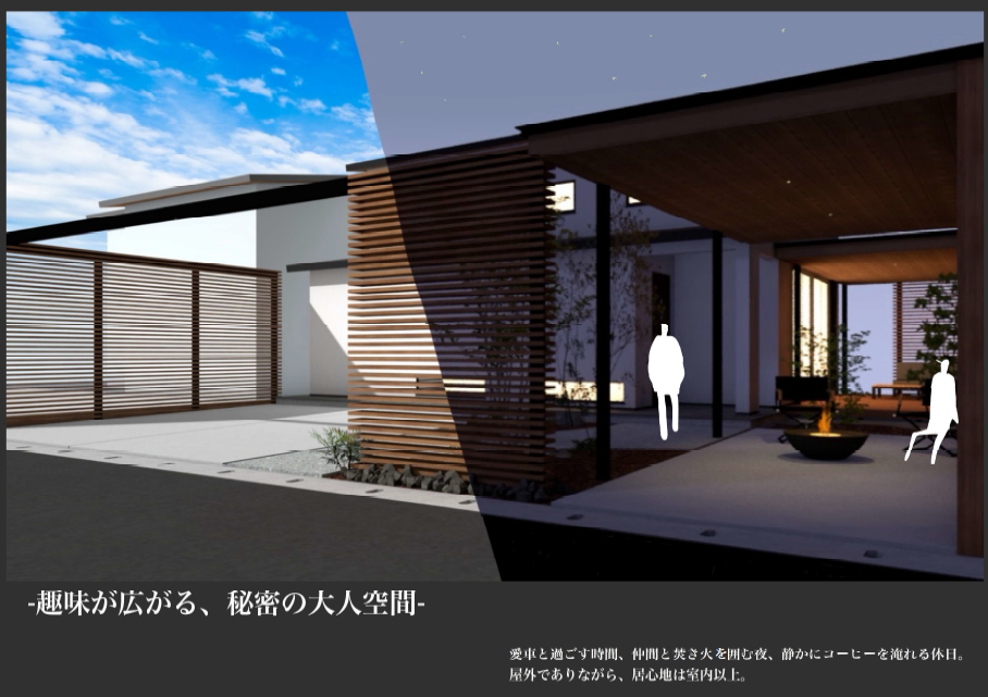 私の自宅もDIYやスノーボードの手入れなど趣味の作業しているところをご近所にあまり見られたくなくて、こもれる車庫があります。最近のキャンプでもおこもりスタイルが流行っていますよね。そういった空間を意識してこのプランを考えました。