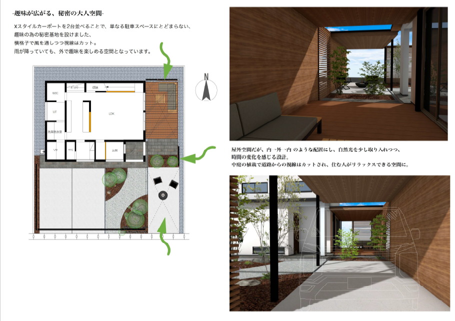 三協アルミのXスタイルカーポートを2棟を隙間をあけて配置し、屋外空間でありながら、内、外、内の関係を作り、自然光とそよ風を取り込む設計としました。また適宜、横ルーバーによって視線のカットをしつつ、風は抜けるように計画しました。