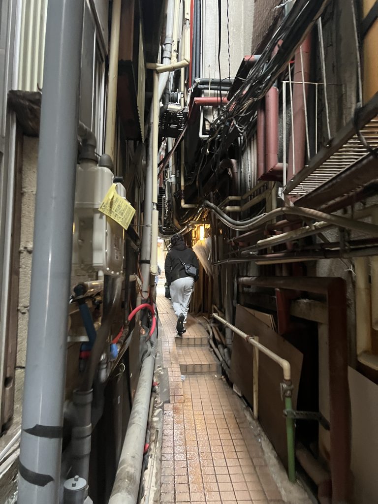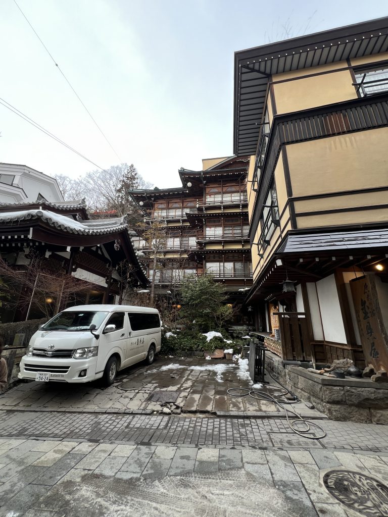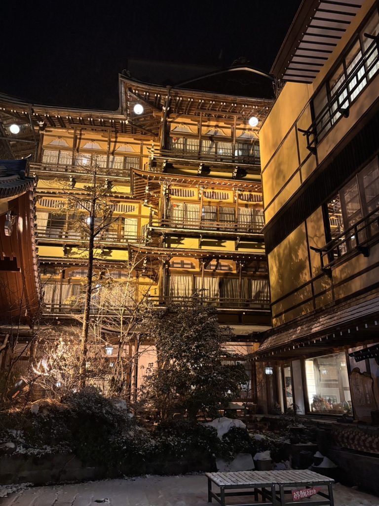 渋温泉にある「金具屋」は、昼と夜とで雰囲気が大きく変わります。