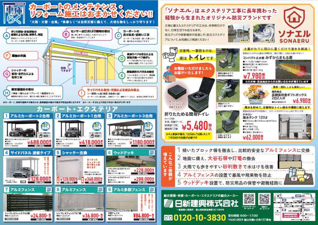 カーポートや外構のメンテナンスを行う 「車庫らく」 のご案内も掲載しております。
